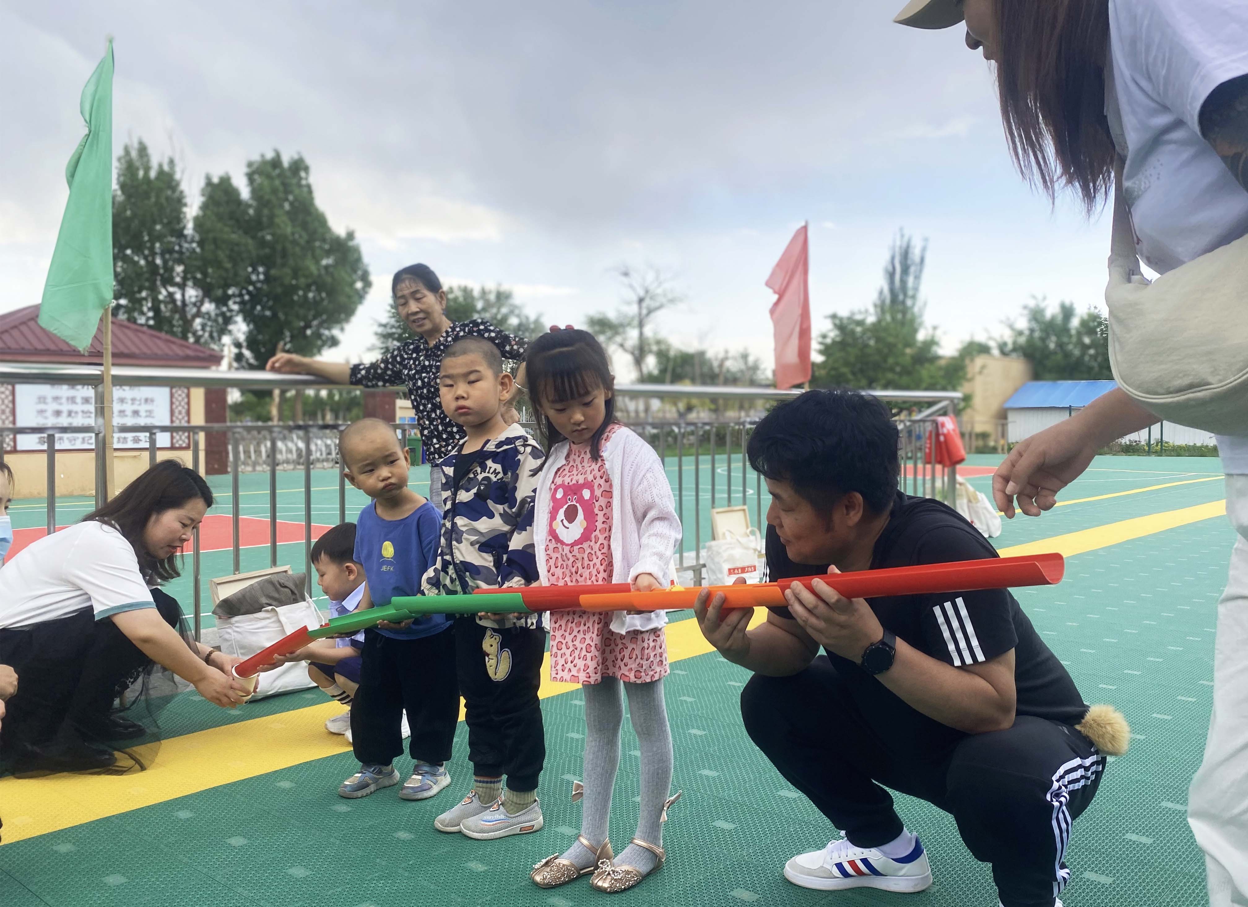 該活動分為小朋友組和家長組。游戲開始時,每個隊員牽拉同心鼓上面綁的繩子,保證鼓面水平,同時裁判將一個排球從鼓面中心上方豎直拋下,隊員齊心協力將球顛起,顛的球越多,為獲勝。 大朋友、小朋友們玩的不亦樂乎。通過三組趣味游戲,讓家長和小朋友們共同協作,完成不同的游戲任務,不僅鍛煉孩子們的團隊配合能力,隨機應變能力,還讓孩子們感受到節日的快樂。