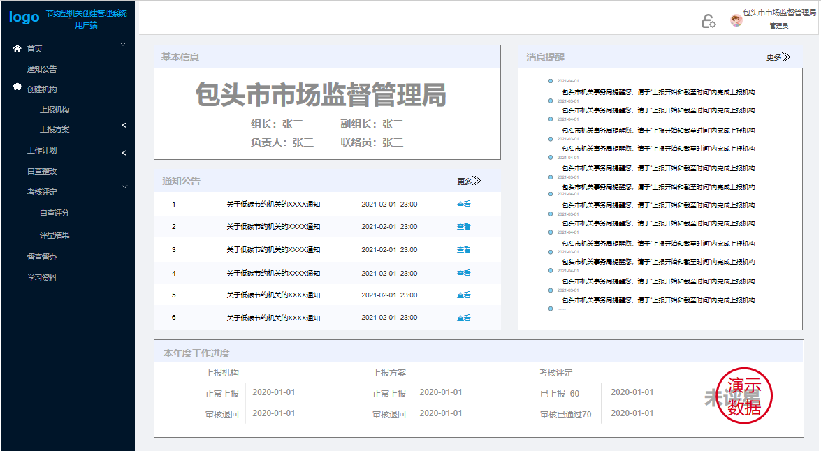 主要實現(xiàn):上報創(chuàng)建機構(gòu)、上報方案,制定工作計劃并記錄完成情況,對本單位進行自查并記錄自查整改記錄,根據(jù)下發(fā)考核任務對本單位進行評分并上傳自評報告。以及低碳節(jié)約相關(guān)學習學習資料的查閱。