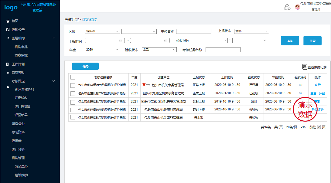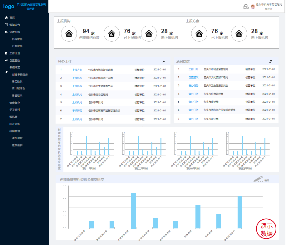 主要實現(xiàn):對創(chuàng)建機構(gòu)和上報方案的審批、下發(fā)督辦任務、創(chuàng)建考核任務并對創(chuàng)建單位驗收評定星級。還可以查看黨政機關(guān)上報的工作計劃、查看黨政機關(guān)的自查整改記錄,對黨政機關(guān)工作的催辦已經(jīng)對低碳節(jié)約相關(guān)資料的維護。